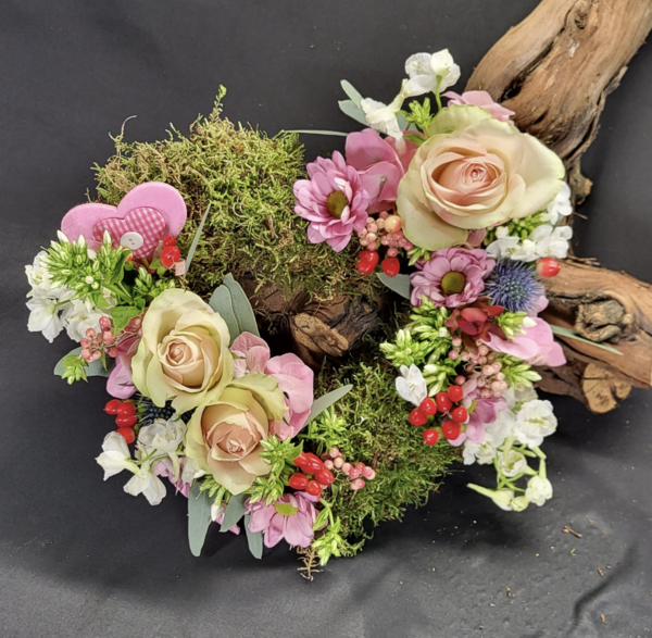 We hebben deze keer de keus uit twee voorjaarsstukken De eerste is een hart van steekschuim opgemaakt met diverse bloemen en mos.