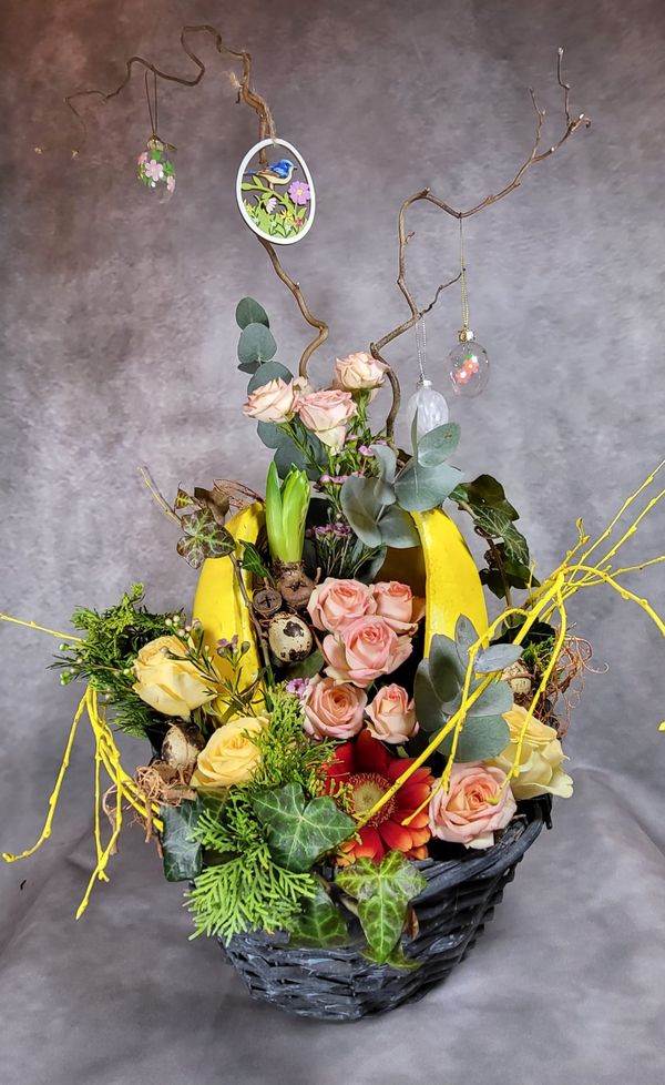 Een mand met een piepschuim ei, verse bloemen in steekschuim, een paastak en vrolijke paasdecoratie.