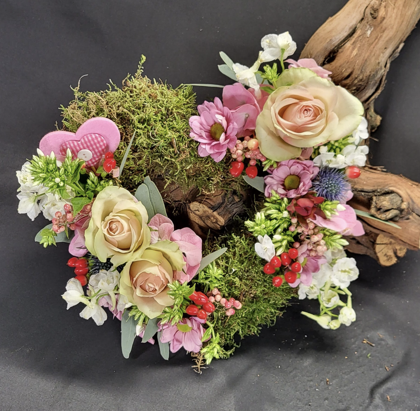 Ik heb voor de voorjaars/valentijnsworkshop twee stukken gemaakt. Nr 1 is een hart van steekschuim opgemaakt met diverse bloemen en mos.