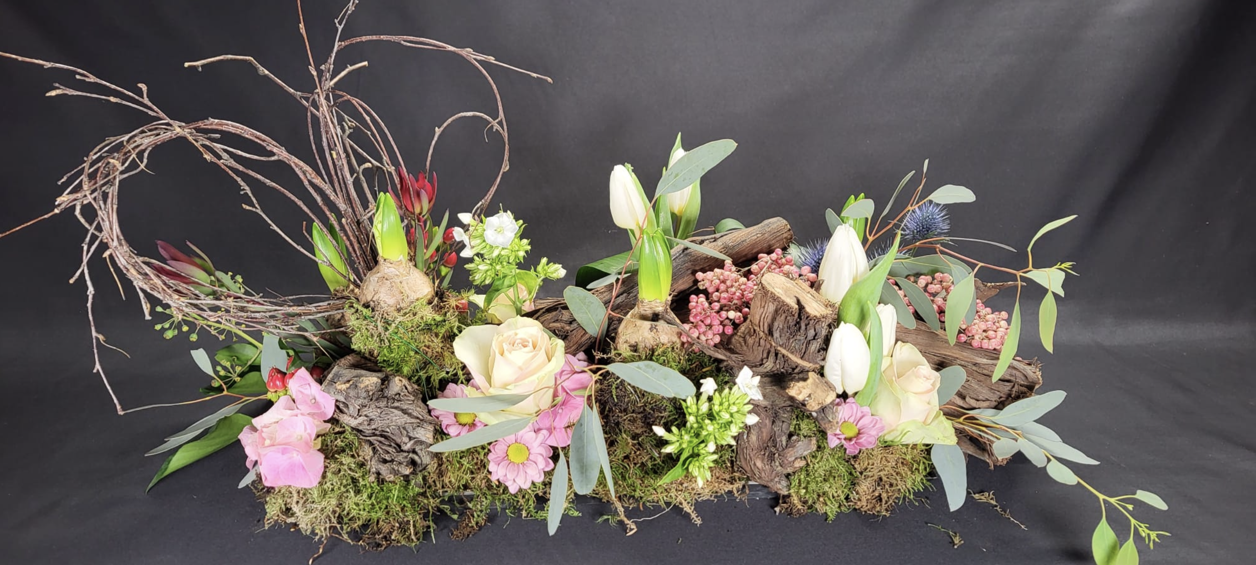 Het tweede is een langwerpig stuk met stronken, voorjaarsbolletjes en verse bloemen.